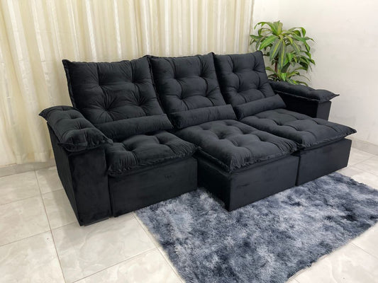 Sofá Retrátil Reclinável Barcelona 2.30m Veludo Preto - D33 e Molas Ensacadas