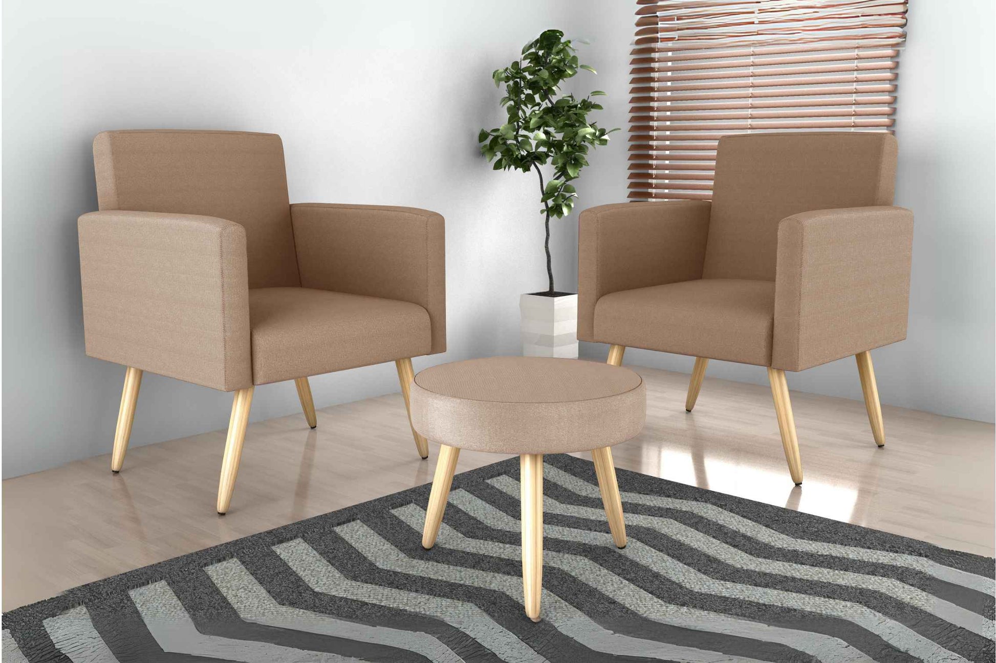 Eleve seu ambiente com estas poltronas e puff, que combinam assentos e encostos em espuma D20 com percinta elástica para conforto sublime. A estrutura de madeira de eucalipto e os pés elegantes garantem durabilidade e um toque sofisticado.