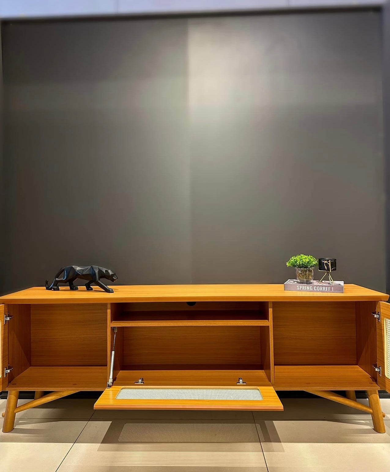 Dobradiça metálica, Para TV até 75", Pés em madeira maciça, MDP/MDF