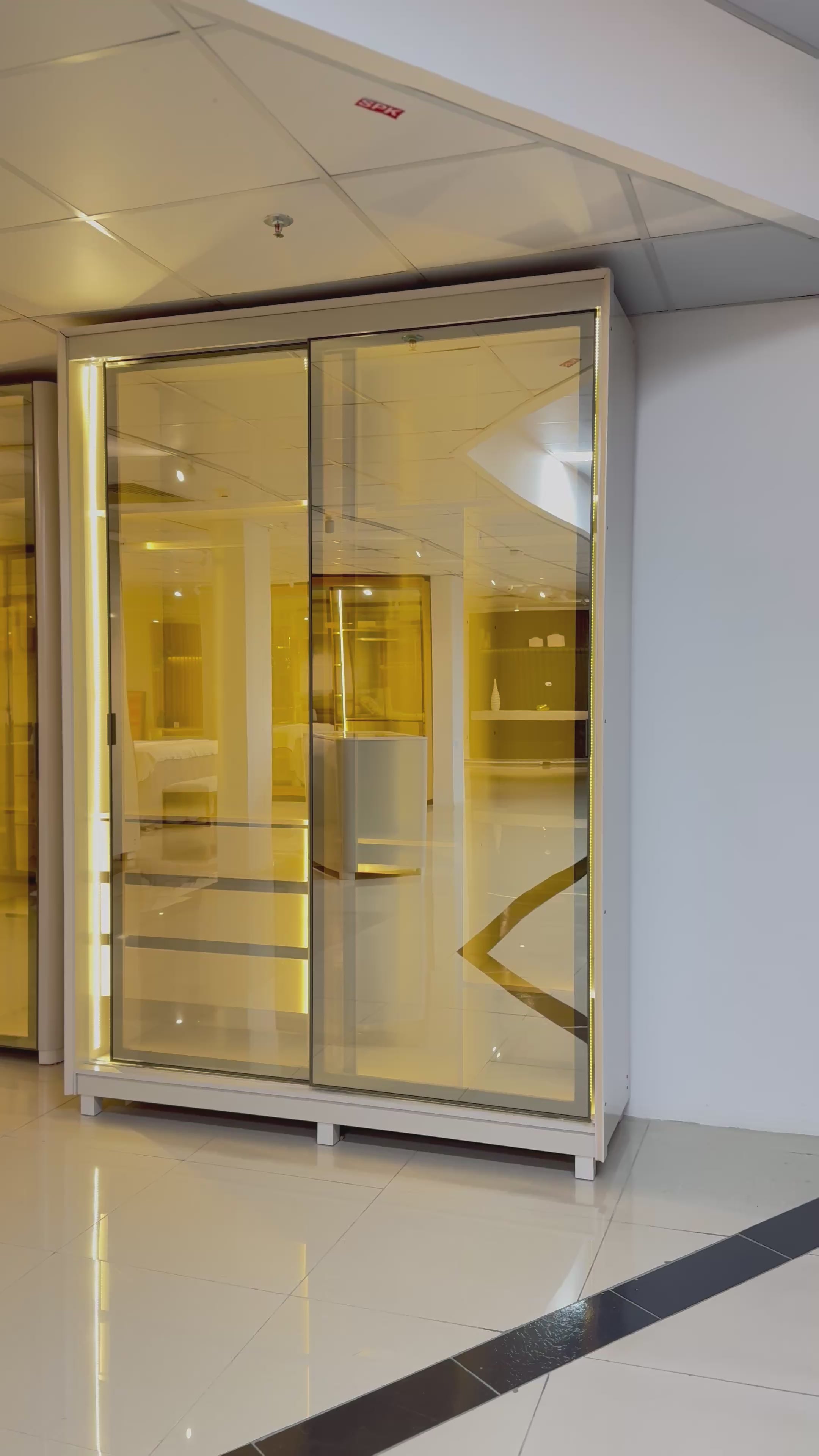 Portas em vidro reflecta com requadro em alumínio e Iluminação LED em cor quente nas laterais e divisórias